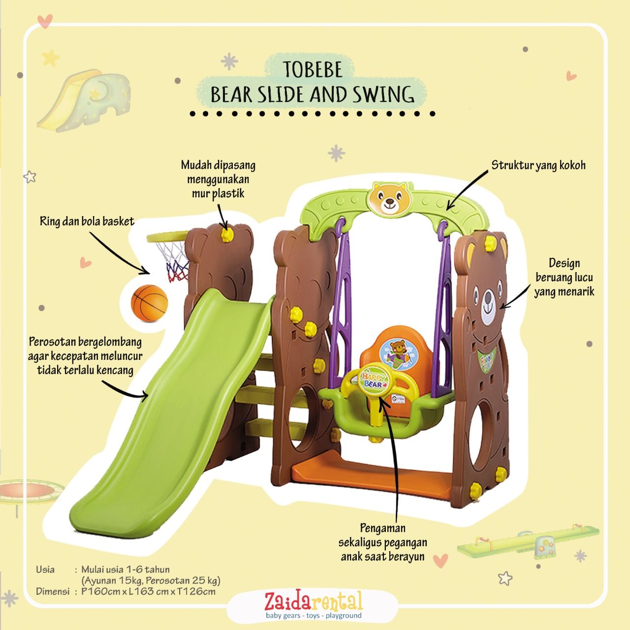 Ayo sewa Bear Slide & Swing 4 in 1 agar si kecil tetap dapat bermain aktif di rumah. Anak dapat melatih motorik kasarnya dengan bermain perosotan, ayunan, melempar bola ke ring dan juga dengan merangkak melewati lubang.