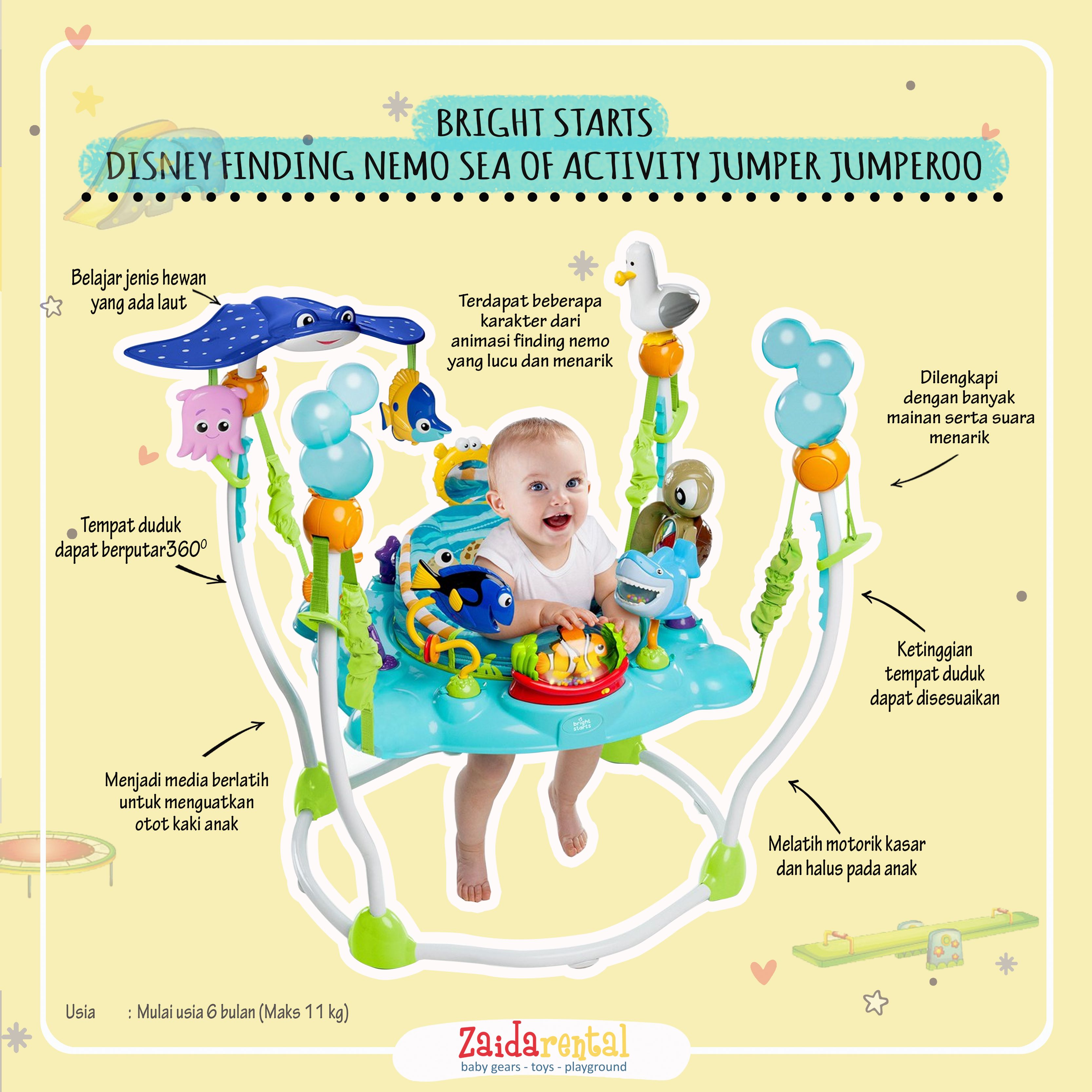 Si kecil akan melompat-lompat gembira sambil bermain di Bright Starts Finding Nemo Sea Of Activities Jumper.