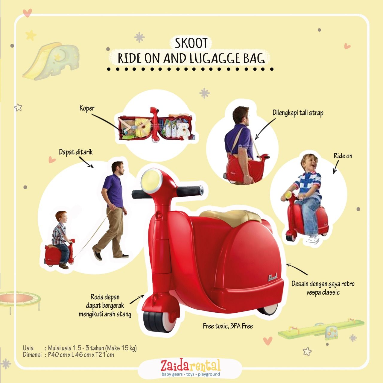Skoot Ride-on suitcaseberguna untuk meletakkan barang-barang anak di dalamnya.