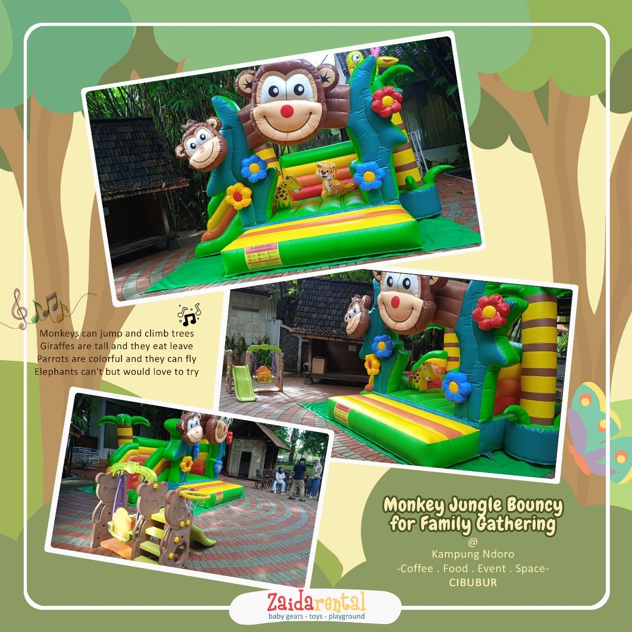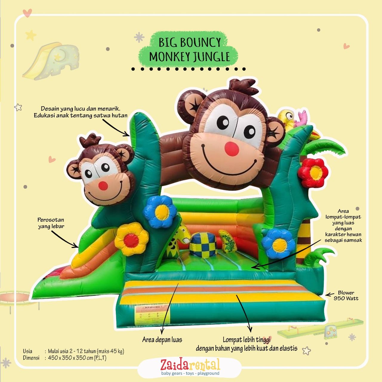 Ikon monkey dan hewan-hewan lainnya membuat tampilan bouncy jadi makin menggemaskan. Di dalam bouncy terdapat area lompat-lompatan yang luas, panjatan dan perosotan yang tinggi.