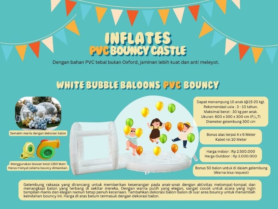 Tambahkan dekorasi balon-balon di luar area bouncy untuk menambah keindahan bouncy ini. Harga di atas belum termasuk dengan dekorasi balon.