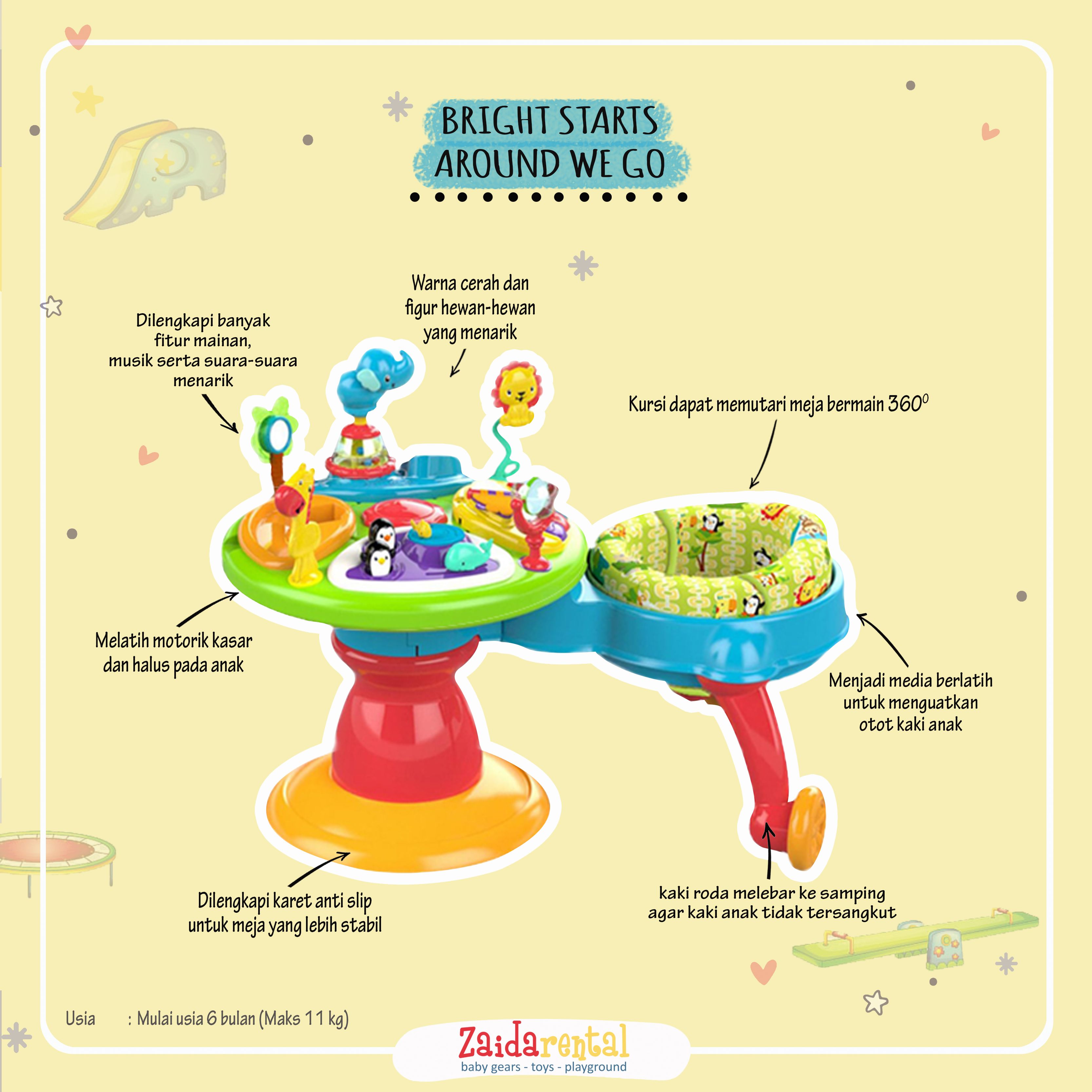Bright Starts Around We Go dapat disewa untuk dan digunakan sejak usia 4 bulan, namun biasanya baru dipakai sekitar usia 6 bulan ketika anak sudah mulai kuat berdiri.