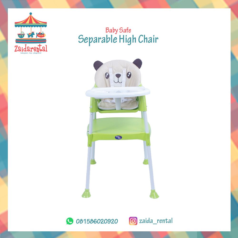 Kursi makan bayi yang aman, baik dari sisi kualitas materialnya yang terjamin, maupun dari bentuk kursinya. Dengan sandaran kursi yang disetel 110° sesuai dengan postur duduk terbaik, serta alas yang empuk, membuat anak nyaman saat duduk. Meja makan serta sarung pada kursi juga dapat dilepas sehingga mudah dibersihkan. Saat bayi beranjak balita, kursi makan dapat digunakan terpisah menjadi meja dan kursi, sehingga dapat digunakan untuk melatih perkembangan anak, seperti melakukan kegiatan menggambar, menulis, bermain dan sebagainya.